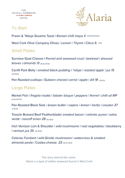 Welcome to Alaria, Schull’s newest restaurant overlooking the Atlantic Ocean. A modern, coastal bistro with a passion for fresh, hyper-local ingredients, Alaria celebrates the rich bounty of West Cork — from Gubbeen cheese to Skeaghanore duck — elevated with international influences and bold, vibrant flavours.